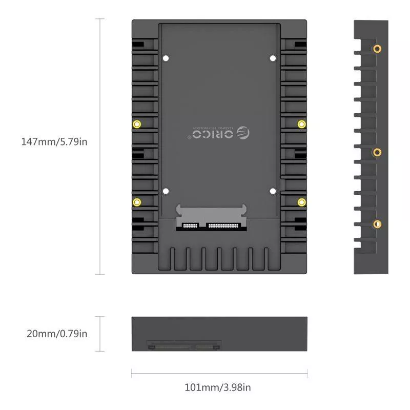 Fabricat din material ABS; dimensiunile, greutatea și găurile de șuruburi sunt similare cu unitățile de hard disk de 3,5 inch.