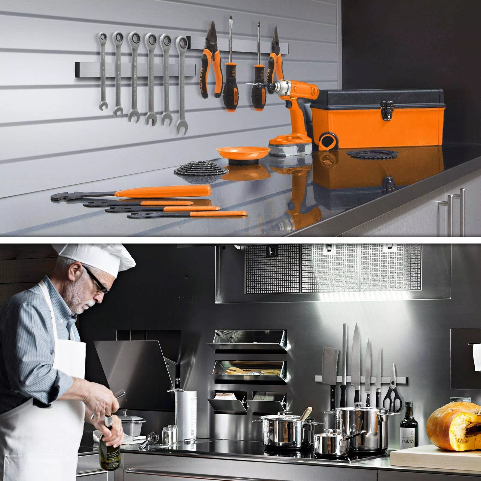 Suportul este ideal atat pt. depozitarea ustensilelor de bucatarie metalice, cat si pt. tinerea la indemana a sculelor unui atelier.