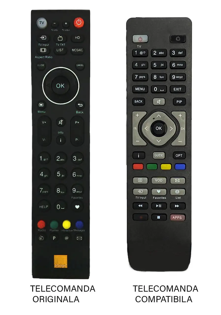 Telecomanda originala, afisata in stanga, este prezentata doar cu titlu de referinta, pentru a arata compatibilitatea.