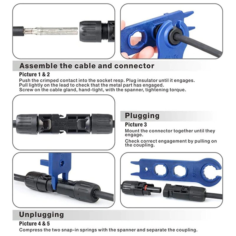 – Conectori tip MC4 (mama si tata) destinati utilizarii pe cabluri solare, permit conectarea profesionala a panourilor fotovoltaice, asigurand o conexiune stabila si sigura.